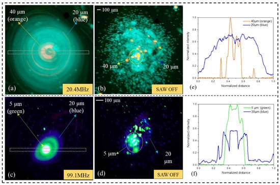 - Skowronek, V.; Rambach, R.W.; Schmid, L.; Haase, K.; Franke, T. Particle deflection in a poly(dimethylsiloxane) microchannel using a propagating surface acoustic wave: Size and frequency dependence. Anal. Chem. 2013, 85, 9955–9959. [Google Scholar] [CrossRef] [PubMed]