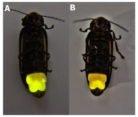 - Viviani, V.R.; Bechara, E.J. Bioluminescence of Brazilian fireflies (Coleoptera: Lampyridae): Spectral distribution and pH effect on luciferase-elicited colors. Comparison with elaterid and phengodid luciferases. Photochem. Photobiol. 1995, 62, 490–495. [Google Scholar] [CrossRef]