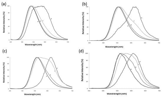 Effect of pH on bioluminescence spectra of four firefly luciferases displaying distinct pH sensitivities. Reprinted with permission from ref. []. Copyright 2011 Royal Society of Chemistry. (a) Amydetes viviani; (b) Cratomorphus distinctus; (c) Photinus pyralis, and (d) Macrolampis sp2. (A) pH 6.5; (B) pH 7.0; (C) pH 7.5, and (D) pH 8.0.