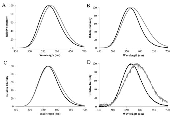 Temperature sensitivity. Temperature also affects the spectrum of firefly luciferases [,]. We demonstrated that luciferases with the most blue-shifted spectra display lower sensitivity to pH []. These observations corroborate the hypothesis that the active sites of the most blue-shifted luciferases are more rigid, whereas those of the most red-shifted and pH-sensitive luciferases are more flexible []. Mochizuki et al. also investigated the effect of temperature on the quantum yield of firefly luciferase []. Similar to the effect of pH and heavy metals, they showed that only the green component is temperature-sensitive, whereas the red and orange components are insensitive [].