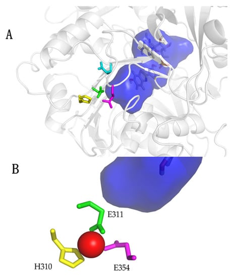 Structure of the metal-binding site in Amydetes viviani firefly luciferase: (A) Zoom showing the metal-binding site residues (yellow: H310; green: E311; magenta: E354) and oxyluciferin phenolate binding site (deep blue); (B) Metal-binding site showing zinc in red, being coordinated by the side chains of H310, E311 and E354. Reprinted from ref. [].