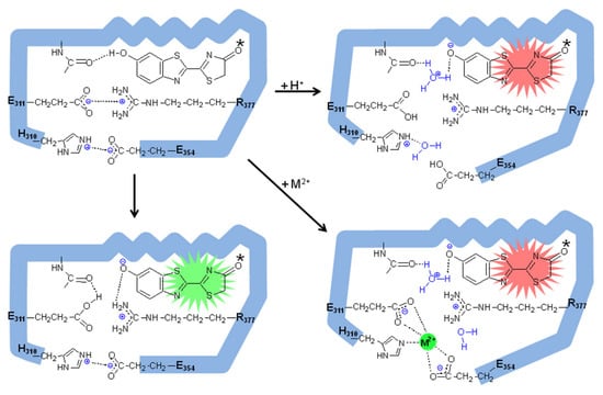 A comparison of the above and other pH-sensitive firefly luciferase primary structures, modeling studies and site-directed mutagenesis showed important substitutions that affected the proportion of green and red light, as well as the pH sensitivity [,,]. Among them, the natural substitution E354N in Macrolampis firefly luciferase was clearly shown to be responsible for the broader and more red-shifted spectrum of this luciferase in relation to the closer P.pyralis and Cratomorphus luciferases []. Indeed, the substitution of the negatively charged E354 in Cratomorphus luciferase, by the neutral asparagine, which is naturally found in Macrolampis luciferase, decreased the sensitivity to zinc, also providing the first evidence of the importance of this site for metal binding []. The identification of the electrostatic pair H310 and E354 by modeling studies in firefly luciferase [,] also led to the identification of the close salt bridge E311 and R337, which later was shown to stabilize the closed hydrophobic conformation of the luciferase luciferin-binding site []. These results finally led to the identification of the pH-sensor and metal-binding site which involve the carboxylates of E311 and E354, and the imidazole or other nucleophilic side-chains of H310 (S/T310) as the proton and metal-binding sites (Figure 4) responsible for pH and metal sensitivities in firefly luciferases []. The identity and geometry of these sites, which include histidines and glutamates, indeed resemble the metal-binding sites of several zinc and cadmium metal-binding proteins [,]. The E311 carboxylate is a critical base responsible for pH sensitivity and is very likely to be involved in the chemiexcitation step by accepting the oxyluciferin phenolate released proton (Figure 5; []), whereas protons and metals such as zinc, lead and mercury, apparently bind to the basic or negatively charged side-chains of H310, E311 and E354, disrupting the active site salt bridges, polarizing the excited oxyluciferin phenolate binding site and promoting red light emission (Figure 5; []). Whereas the phenol group of excited oxyluciferin was shown to be critical for pH sensitivity and for bioluminescence color modulation [], the influence of the keto-enol tautomerization may also exert a critical influence on bioluminescence color modulation [].