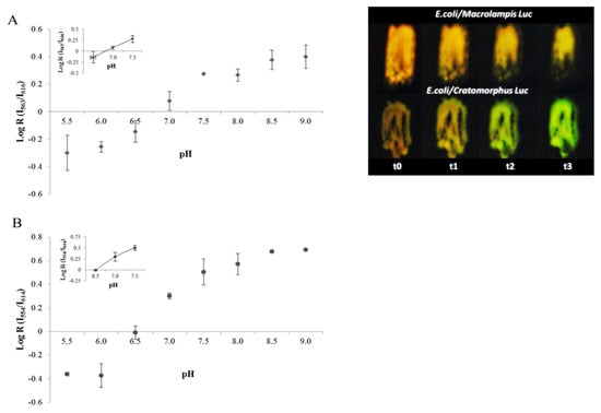 (Left graph) ratiometric analysis of pH in bacteria using: (A) Macrolampis and (B) Cratomorphus firefly luciferases; (right image) effect of pH on in vivo bioluminescence of E. coli colonies expressing Macrolampis and Cratomorphus firefly luciferases; (t0–t3) represent the time (minutes) when the bioluminescence image was taken after addition of acidic D-luciferin. Reprinted with permission from ref. []. Copyright 2014 Royal Society of Chemistry.
