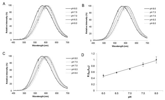 Bioluminescent reporters that use two or more emission colors are well known and were extensively used for dual and tricolor reporting in gene expression studies (www.promega.com.br/products/luciferase-assays/reporter-assays/dual_luciferase-reporter-assay-system/?catNum=E1910 (accessed 10 January 2022)) []. However, they usually rely on the use of two or more luciferase reporter genes [] and are rather used to analyze gene expression instead of intracellular homeostasis indicators such as pH and metal concentrations.