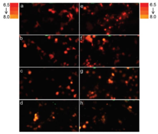 Firefly luciferase color reporting of intracellular pH change in mammalian cells. In vivo bioluminescence color change of COS-1 cells transfected with pCMV-Mac expressing Macrolampis firefly luciferase at different pH in calibration buffer containing nigericin. Reprinted with permission from ref. []. Copyright 2019 Royal Society of Chemistry. (left panels: a–d) luciferase directed to cytoplasm; (right panel: e–h) luciferase directed to nucleus; (a,e) pH 6.5; (b,f) pH 7.0; (c,g) pH 7.5; and (d,h) pH 8.0. The reddish bioluminescence indicates acidic pH, whereas the orange-yellow indicates more alkaline pH.