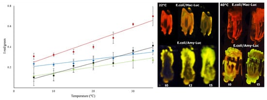 Comparison of the effect of temperature on the ratio of bioluminescence color of beetle luciferases: (left graph) ratiometric estimation of temperature using distinct firefly luciferases. (red) Macrolampis sp2; (black) Photinus pyralis; (green) Cratomorphus distinctus, and (blue) Amydetes viviani; (right images) in vivo bioluminescence color of E.coli colonies expressing Macrolampis sp2 (Mac-Luc) and Amydetes viviani (Amy-Luc) luciferases, after spraying D-luciferin, at 22 and 40 °C. Reprinted with permission from ref. []. Copyright 2014 Royal Society of Chemistry. One can see that the luciferases with steeper curves such as Macrolampis luciferase (red) are the most sensitive to temperature, and those with less steep curves, such as Amydetes viviani luciferase (blue), are the least sensitive.
