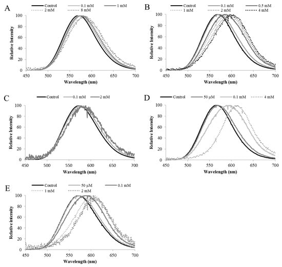 Bioluminescence spectra of Macrolampis sp2 firefly luciferase and its mutants showing spectral change at different concentrations of ZnSO4: (A) Wild-type; (B) N354H; (C) H310C; (D) N354C; (E) H310C/N315C; Reprinted with permission from ref. []. Copyright 2016 Springer.