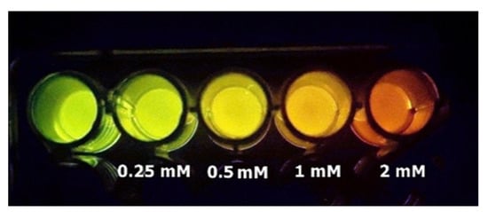 Considering that the firefly bioluminescence spectrum changes from green to red at an acidic pH, in 2005 we first proposed that pH sensitivity could be harnessed to estimate pH and metals []. We then analyzed the effect of the pH on the ratio of bioluminescence intensities in the green and red regions and found that there is a ratiometric relationship between pH 6.0 and 8.0 (Equation (1)) using Macrolampis sp2 and Cratomorphus distinctus firefly luciferases, allowing the estimation of intracellular pH changes in live E. coli bacteria []. We found that the bacterial intracellular pH was estimated to be approximately 7.1, in agreement with reported values using other methodologies. The results also showed that at an acidic pH, luciferin may act as a proton shuttle to the intracellular environment, initially acidifying the intracellular pH, producing reddish bioluminescence in bacteria (Figure 6), which then gradually changes to yellow-green, clearly showing that the intracellular buffering capacity of bacteria was recovered after some time.