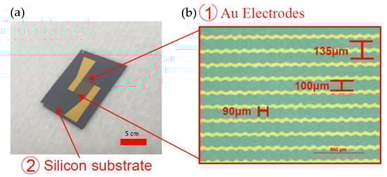 Monocrystalline silicon (mono c-Si) was used as the substrate for the manufacturing process. The mono c-Si substrate has a high photoelectric conversion efficiency. The standard yellow light lithography process was used for chip fabrication [,]. The process used the pattern defined by the photomask for substrate fabrication. The required electrode pattern was obtained, and the wafer-manufacturing process was divided into two steps: (A) Au/Cr electron beam evaporation and (B) the electrode lithography process.