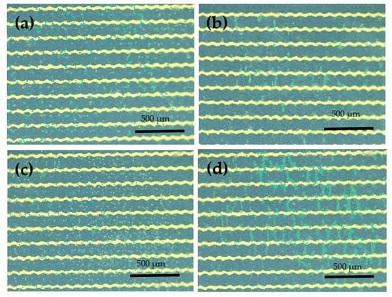 S1813, a positive photoresist, was used in spin-coating. The silicon substrate was first cut to an appropriate size and treated with acetone, methanol, and DI water. The glass wafer was placed in a photoresist coater, and an appropriate amount of S1813 positive photoresist was added for coating. It could be uniformly spin-coated on the substrate at a height of approximately 3 μm through high-speed rotation. After the spin-coating of the photoresist, it was placed in a 90 °C hot plate for four minutes for soft baking. The purpose of this was to volatilize the organic solution in the photoresist through heating and prevent the sticking of the photoresist and photomask during exposure. The photoresist was flattened, and the adhesion between the photoresist and substrate was enhanced. Lithography can be divided into three types according to the light source: UV lithography, electron beam lithography, and X-ray lithography. This experiment used a general yellow light lithography process. High-pressure mercury and mercury–xenon arc lamps were in the UV wavelength range and had two high-intensity emission spectral lines in the UV wavelength range of 350–450 nm; that is, two high-intensity emission spectral lines were present, namely g-line (436 nm) and i-line (365 nm). The main purpose of their use was to make the photoresist bond or break in order for the components exposed to light to show considerable differences in the solubility of the developer and to accelerate the pattern transfer. Part of the light that was not absorbed by the photoresist during exposure reached the surface of the substrate through reflection. Incident light waves produced constructive and destructive interference, forming a standing wave effect, which subjected the photoresist to uneven light intensity and resulted in corrugation on the side of the photoresist and a change in the line width of the photoresist.