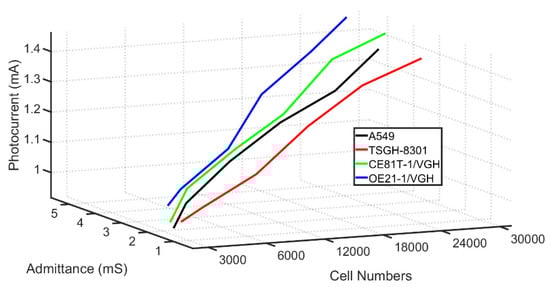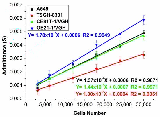 During the initial wafer measurement, no cells were injected above the wafer microelectrode. Only the impedance value of the sucrose solution was measured, and sucrose admittance was calculated. A different number of cells was used in each test to obtain the admittance values of the reference samples (see Supplementary Section S6 for counting of the cells). Figure 3 shows the relationships among changes in the admittance values of the four different cancer cells in each test using a different number of cells. A linear relationship was found between the change in admittance value and the number of cells (see Supplementary Section S5 for the calculation formula for cell admittance measurement). Changes in the relationships between the admittance value and the number of cells showed different slopes in cancer cells in different parts. The differences between the slopes can be used to identify cancer cells. As a non-invasive, label-free electrochemical method, impedance measurements can provide sensitive and quantitative measurements. These advantages mean impedance measurement methods are widely used in cell research and analysis, especially in live-cell analysis and long-term live-cell monitoring.