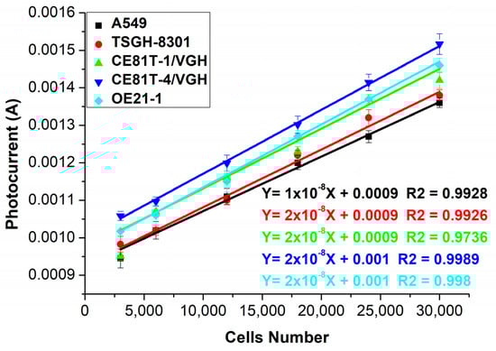 Figure 4 shows the photocurrent response measurement results for four cancer cells in tests using a varying number of cells. CE81T-1 and CE81T-4 were first- and fourth-stage lesions of esophageal cancer cells obtained from an East Asian population, whereas OE21-1 was the first-stage lesion of esophageal cancer cells obtained from a Caucasian population (see Supplement Material, Figure S7 for a schematic diagram of the reparation of the different cells). The photocurrent response curves of the cancer cells at different locations and degrees of cancerous lesions were measured with a microcurrent meter in each test using a different number of cancer cells. As shown in Figure 5, the relationship between the number of cells and the photocurrent response was linear, and the slopes of the photocurrent responses in cancer cells with different cancer lesions and the number of cells were quite different. Compared with the general optical measurement method, the cost was lower, and the detection process was relatively convenient and fast.