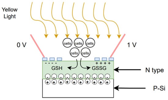 In Figure 3 and Figure 4, the slopes of photocurrent responses and admittance values of different cells stack up on each other. However, by combining both the measurements, as shown in Figure 5, the slopes of different cells are distinct. Therefore, it can be inferred that the sensitivity of the biosensor developed in this study can be increased by combining both the photocurrent response and admittance measurements. The manufacturing process of solar cells follows three steps, as shown in Figure 6. The first two steps in the process are similar to the manufacturing process of current mass-produced silicon solar cells. The first step is to use optical inspection methods to find any defects. The second step is cleaning and etching. The third step is phosphorus diffusion, which involves the use of a micro-galvanometer, which biases the wafer through a probe and uses a light source to excite the carriers to separate the sample. A bias voltage of 1v is given through a microcurrent meter, and an indoor light source is used to excite the sample. The light introduced will be absorbed by the material, thereby increasing the number of holes and electrons. As a result of this, the electric current will increase []. This phenomenon is known as photoconductivity, in which the electric current flowing is a result of the excitation caused by light striking a material []. Additionally, under light, photo-excited electrons and holes will be compelled to realign amid the two semiconductors due to the built-in electric field [,,]. An indoor light source is easy to obtain, which meets the chip development expectations, and the distance between the light source and the chip can be fixed. By exiting the sample and creating a difference in potential across the junction of the two regions, a loss of electrons in the n-region and a subsequent gain in the p-region can be achieved. At this time, when cells are dropped on the N-type surface, the electrons will participate in a reduction reaction in GSSG, which will increase in conductance, because the total number of electrons concentrated on the N side is fixed, so the current will increase, thereby producing a photocurrent response.