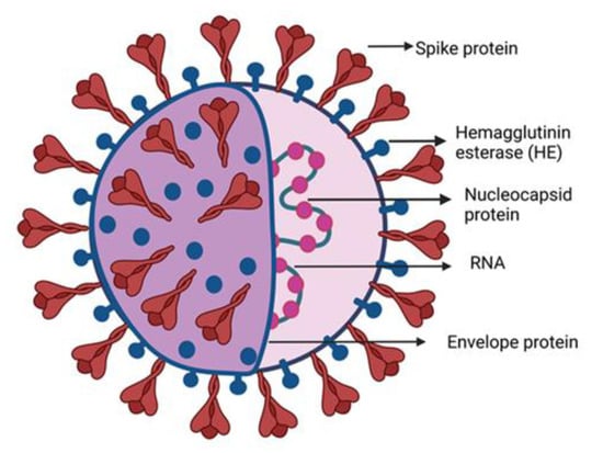 The human coronaviruses causing fatal respiratory diseases were first observed in 1960 as the common flu []. The two pathogens SARS and MERS from the past were found lethal after attacking the respiratory tracts of the patients leading to nosocomial outbreaks [,]. Phylogenetic analysis reveals that bats are the natural reservoirs of SARS and MERS with the intermediate host Asian Palm civet and dromedary camels [,]. Severe acute respiratory syndrome corona virus 2 (SARS-CoV-2) emerged from the animal market in Wuhan, China. A sizeable (100–160 nm) group of spherically sensitive, non-segmented SARS-CoV-2 can infect both animal and human viruses [,,,]. The virus bypassed from the lineage B of coronaviruses due to the proteases breakdown at the receptor binding site of host cells, facilitating the transmission from animal to human [,]. SARS-CoV-2 belongs to the family Coronaviridae, subfamily Orthocoronavirinae, and order Nidovirales, which is further subdivided into four genera alpha (α), beta (β), delta (δ) and gamma (γ) CoVs, respectively. The lineage B of β-CoVs has three more lineages: A, C, and D [,]. The family contains the 10 deadliest human-borne viruses. For example, the death rates for SARS-CoV and MERS-CoV are 10% and 36%, respectively. The α- and β-coronaviruses have their origin in mammals including camels, pigs, bats, and rodents, while the other two δ and γ-coronaviruses infect birds and mammal whales. Generally, these viruses infect the respiratory and digestive tracts of their hosts []. SARS-CoV-2 contains a single strand RNA of ≈30 kb which has a cap-like structure at 5′ and a poly-(A) tail at the 3′ end. In the Figure 1 the structural elements of the SARS-CoV-2 are shown. The genomic RNA is surrounded by the basic structural protein, giving it a crown-like appearance. The nucleocapsid protein (N-protein) enveloped the viral genome in a helical pattern, while the membrane protein (M-protein) incorporated with the inner nucleoproteins to form a basic structure [,,,,].
