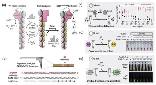 A nucleic acid-based detection by clustered regularly interspaced short palindromic repeat (CRISPR (Cas-9, Cas-12a, Cas-12b, and Cas-13)) is a gene-editing technique that aids researchers to add, delete, or modify the genome at a required specific domain on the gene map [,,,]. A previous study implanted to delete the RNA-based viruses by using Cas-13 from mammals []. The same procedure was used for the detection of the dengue, Zika virus ssRNA genome. The SHERLOCK protocol is a specific and highly sensitive enzymatic reporter unlocking for a portable and multiple nucleic acid base detection from clinical samples. The whole essay includes a series of reactions of pre-amplification of DNA or RNA and subsequent enzymes followed by Cas-12 or Cas-13 mediated detection through colorimetric and fluorescent signals. The observed run time of the assay is less than 15 min, and total signal readouts are provided in less than 60 min []. Moreover, Cas12a, Cas12b, and Cas 13a nucleases cleavage activity are to develop point-of-care testing of SARS-CoV-2 in different studies’ workflows schemes after modifying according to required setups. A more sensitive RT-PCR assay detection was performed (10 copies/reaction in 40 min) by RPA-mediated DNA amplification and signal amplification by CRISPR-Cas-12a []. Another CREST, Cas-13-based detection was performed on low-cost thermocyclers and accessible enzymes such as Taq polymerase based on fluorescence signal amplification to detect ten copies/μL []. All-in-one CRISPR-Cas 12a (AIOD-CRISPR) assay was modified without pre-amplification steps of RNA directly; all incubated components in a single reaction with 4.6 copies of SARS-CoV-2 within 40 min []. Regardless of the advantages, the procedure has some limitations, such as expertise dependent on the preparation of reaction components and reaction steps such as protein purification and RNA extraction. Moreover, multistep amplification and digital quantification may affect precise testing. Another rapid (≈30 min), inexpensive, and easy to handle diagnostic technique introduced the CRISPR-Cas-12 platform as DETECTR (DNA endonuclease-targeted CRISPR Trans reporter for the detection of viral infections) [,]. DETECTR is based on the lateral flow assay alternative to PCR testing, with 95% positive predictive agreement and 100% negative predictive agreement for the viral detection in <40 min []. It is a rapid and multiplex sequence-specific viral RNA detection using RT-LAMP coupling with T7 transcription and Csm-based (Figure 3) detection of SARS-CoV-2 in less than 30 min with an attomolar sensitivity and high specificity. The assay can be applied for the detection of variants and other pathogens as well. The reaction modification is possible to a “one-pot diagnostic” by redesigning primers at 55 °C to enhance the efficiency of T7-Csm at 65 °C []. In a recent study, CRISPR-Cas13 has designed a comprehensive investigation of notable viral RNAs and a broad spectrum observation for antiviral targets of 16 families of human–animal infectious viruses by applying in silico analysis in a ViPR database []. Pre-amplification of RNA limits its high-throughput application. Amplification-free CRISPR-Cas-13a is based on mobile phone microscopy that directly detects viral RNA from the nasal swabs. Moreover, the combination of crRNA may increase the sensitivity to the attomolar range (≈30 copies/μL). Multiple target recognition by crRNA avoids the detection conflicts raised after the variants interference []. Another detection strategy is CRISPR-Cas-13d PAC-MAN (prophylactic antiviral CRISPR in a human cell) RdRp and N-antigen of the SARS-CoV-2 and also worked on Influenza A.