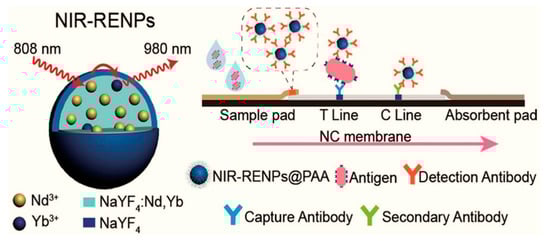 Near-Infrared Lanthanide—Doped Nanoparticles (NIR-RENPs), lateral flow immunoassay test format for the viral antigen detection. Reproduced with permission []. Copyright © 2020 American Chemical Society.