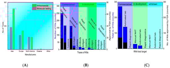 FDA-approved commercial kits: (A) The number of testing kits (molecular and Immunoassay based) produced by the Global manufacturers (B) Status of molecular-assay based kits, (C) Status of serological assay based.