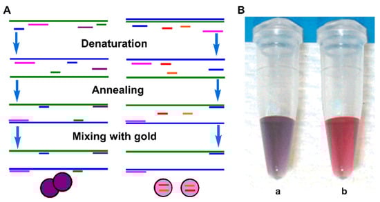 In 2004, Rothberg and coworkers first combined PCR with AuNPs, serving as a signal reporter to detect partial genomic DNA based on the selective affinity of AuNPs to ssDNA [46]. The authors designed ssDNA probes that were complementary to the desired PCR product, and had melting temperatures lower than the primers. The PCR product dsDNA was dehybridized into ssDNA at 95 °C, then the mixture was annealed below the melting temperatures of the probes, causing the hybridization between dsDNA and ssDNA. When AuNPs were added to this solution, there was immediate salt-induced AuNP aggregation, along with a color change in the solution from pink to purple (Figure 1). In contrast, when the dsDNA was not complementary to the ssDNA probes, the probes were absorbed on the AuNPs surface to prevent aggregation (Figure 1Bb). The method could be applied to detect single nucleotide polymorphisms (SNPs) in a long-QT-syndrome clinical sample. However, to reduce the potential interference, it needs to add AuNP probes into the PCR products after PCR amplification.
