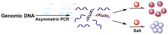 As conventional PCR only produces product dsDNA, the coupling of AuNPs to PCR necessitates additional ssDNA probes and additional steps. An asymmetric polymerase chain reaction (As-PCR) is capable of generating ssDNA product, offering the possibility of directly combining AuNPs and PCR [47,48]. Deng et al. reported that As-PCR was used to amplify the targeted sequence into a large amount of amplified ssDNA, which bound to naked AuNPs, enabling colorimetric detection (Figure 2) [49]. The presence of the target enabled As-PCR to produce large ssDNA amplicons, which wrapped around AuNPs to stabilize nanoparticles against salt-induced aggregation, and the red color of the AuNPs remained unchanged (Figure 2). In contrast, the absence of the target did not produce ssDNA amplicons, inducing the aggregation of AuNPs with a red-to-blue color change in the solution. This method was applied to detect Bacillus anthracis in clinical samples. This work demonstrated that long genomic ssDNA (508 nt/bp) also effectively stabilized AuNPs, largely expanding its application in an ssDNA-producing sensing system. Recently, Chen et al. expanded this strategy for the colorimetric detection of Salmonella-spiked lettuce samples by using the long ssDNA of As-PCR to stabilize bare AuNPs [50]. In addition, this strategy was also applicable in the detection of a small molecule, in which As-PCR produced a paraquat aptamer, and the presence of paraquat consumed the aptamer, causing the aggregation of bare AuNPs [51].