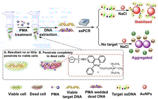Traditionally, discrimination of live and dead bacteria relies on culture-based methods, whereas these methods are time-consuming, labor intensive and have low sensitivity [52,53,54]. Although fluorescent probes have been widely explored for selectively staining live bacteria, these probes suffer from low sensitivity [54,55,56,57]. Meanwhile, DNA-based PCR also cannot distinguish between live and dead bacteria, as DNA remains detectable after bacteria death [58,59]. Xu and coworkers expanded the AuNP-involved As-PCR biosensor for the selective detection of live emetic Bacillus cereus [60]. As propidium monoazide (PMA) selectively intercalates DNA in dead cells with compromised membranes, it can covalently cross-link with DNA under UV irradiation, preventing DNA amplification [61]. After PMA treatment, the target DNA was amplified using As-PCR; then, the resultant ssDNA stabilized AuNPs against salt-induced aggregation, so the color of the solution remained red (Figure 3). This method shows good sensitivity against live emetic Bacillus cereus in milk with a detection limit of 3.4 × 102 CFU/mL. This method was proven to be effective in discriminating emetic Bacillus cereus from the other eight strains in milk; moreover, it provides a solution for the detection of live pathogenic bacteria, overcoming the drawbacks of PCR-based assays in the discrimination between live and dead bacteria. However, the efficiency of As-PCR amplification is much lower than that of conventional PCR, and the sensitivity of these methods is limited.