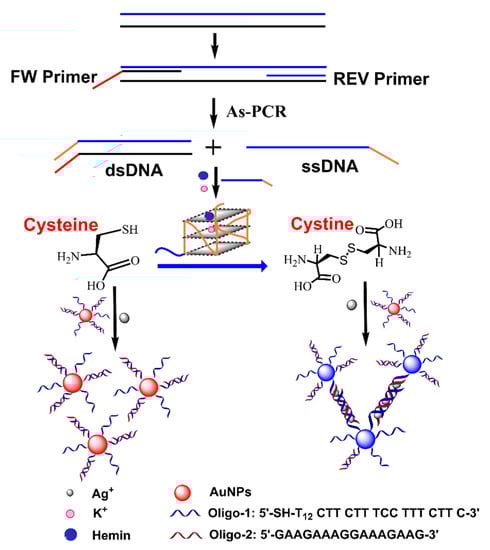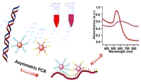 - Deng, H.; Xu, Y.; Liu, Y.; Che, Z.; Guo, H.; Shan, S.; Sun, Y.; Liu, X.; Huang, K.; Ma, X. Gold nanoparticles with asymmetric polymerase chain reaction for colorimetric detection of DNA sequence. Anal. Chem. 2012, 84, 1253–1258. [Google Scholar] [CrossRef] [PubMed]