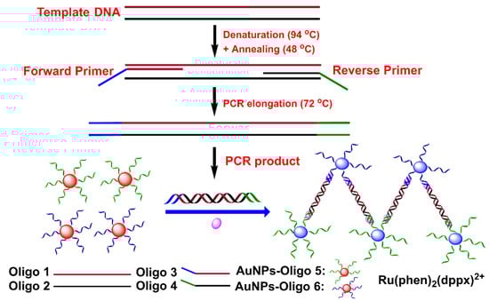 - Wang, J.; Li, T.; Li, H.; Li, G.; Wu, S.; Ling, L. A universal colorimetric PCR biosensor based upon triplex formation with the aid of Ru(phen)2dppx2+. Sens. Actuators B Chem. 2019, 278, 39–45. [Google Scholar] [CrossRef]
