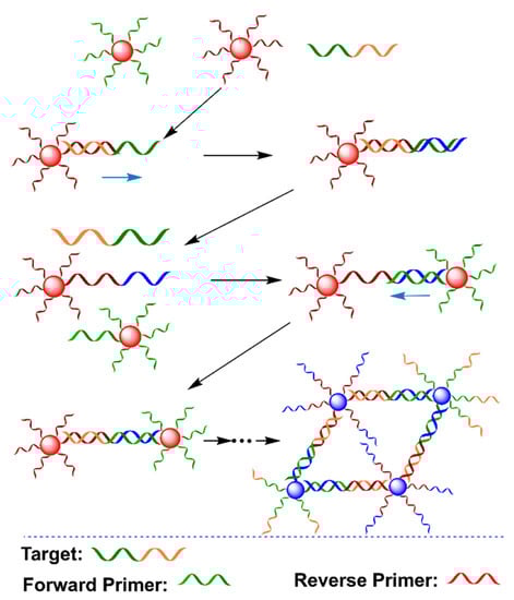 The integration of SNAs into the PCR amplification process may obviate the post-treatment of the PCR product, enabling the rapid and real-time detection of DNA sequences (Table 3). To achieve this goal, Wang and coworkers reported a colorimetric PCR method for the detection of a specific DNA by using two kinds of primer-functionalized AuNPs (Figure 7) [83]. The forward primer was designed to be the same as partial target DNA, while the reverse primer was complementary to partial target DNA. The presence of target DNA initiated the extension of the reverse primer on AuNPs as a template that was complementary to the forward primer on AuNPs. Thus, the PCR amplification process led to DNA-mediated AuNP assembly. The assembly of AuNPs induced a redshift of the absorbance peak at 519 nm with a corresponding color change from red to pink/purple. The detection can be achieved after five cycles of PCR (about 15 min) in one pot. However, it is worth noting that the length of the target DNA should be over 20 nt (~6.8 nm) to overcome the steric hindrance caused by Taq polymerase. In addition, the applicability of this method in real samples is unclear.