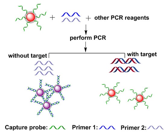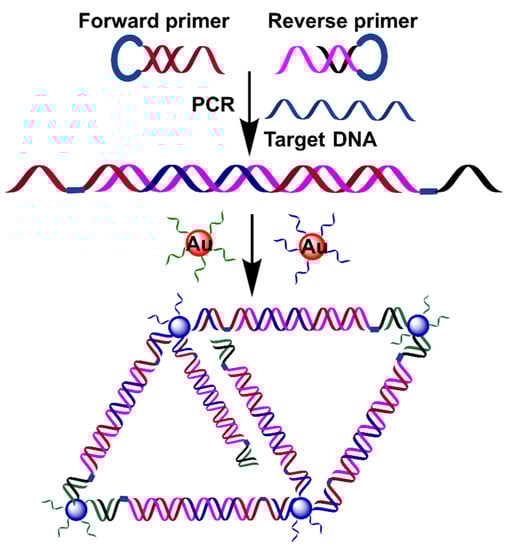 Typically, with SNAs, it is difficult to recognize the dsDNA from routine PCR products, so the combination of SNAs and PCR generally relies on As-PCR [72,73]. To solve this problem, triplex DNA was used for the direct combination of SNAs and conventional PCR, in which the dsDNA product from PCR formed triplex DNA with ssDNA on AuNPs’ surfaces, thus inducing the self-assembly of AuNPs (Figure 6) [74]. The strategy was capable of detecting short dsDNA (49 bp) and long dsDNA (321 bp). The applicability of this method was further demonstrated to detect Escherichia coli with a detection limit of 1.0 Pg/L. This method is universal and simple. However, triplex DNA is less stable than dsDNA, [75,76] and its application in real samples remains unexplored.