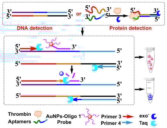 Currently, the combination of PCR and AuNPs for the colorimetric detection of proteins is mainly limited to the step of transforming protein information into DNA information. Although AuNPs have also been explored for combination with immuno-PCR, the use of antibodies complicates the sensing systems and raise the cost of the assays, limiting their applications [98,99,100]. The discovery of aptamer renders this transformation easier and more effective [101]. This has been exemplified by the work of Wang et al., [97] which uses two aptamers to transfer thrombin information into a DNA signal, obviating the use of an antibody. However, there is still a long way to go. It needs additional effort to further demonstrate that the combination of PCR and AuNPs is a viable strategy to detect protein biomarkers, such as viral proteins and cancer-related proteins.