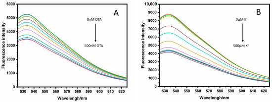 (A) Fluorescence emission spectra of unlabeled fluorescence antiparallel G-quadruplex with different concentrations of OTA (0, 0.48, 0.96, 1.95, 3.9, 7.8,15.6, 31.2, 72.5, 125, 250, 500 nM), (B) Fluorescence emission spectra of unlabeled fluorescence parallel G-quadruplex with different concentrations of K+ (0, 0.48, 0.96, 1.95, 3.9, 7.8,15.6, 31.2, 72.5, 125, 250, 500 µM).
