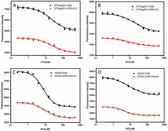 For OTA, 80 µL of different concentrations of OTA were mixed with 20 µL of 100 nM aptamer (antiparallel G-quadruplex) in a solution of 10 mM Tris-HCl buffer (pH = 8.4), with 1.5X SGI, 1.0% Tween 20 and 31.25 mM Ca2+. For K+, 80 µL of different concentrations of K+ were mixed with 20 µL of 100 nM parallel G-quadruplex in 10 mM Tris-HCl buffer (pH = 8.4), with 1.5× SGI, 1.0% Tween 20. All the test solutions were incubated at room temperature for 20 minutes, followed by the fluorescence measurement with a Safire II microplate reader. All experiments were repeated three times independently.