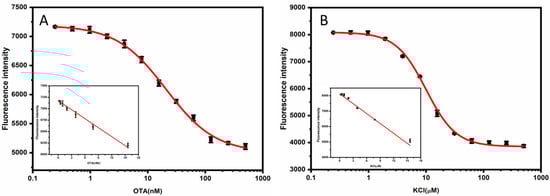 (A) Calibration curve for OTA. The inset shows the linear relationship between the fluorescence intensity and the concentration of the OTA (B) Calibration curve for K+. The inset shows the linear relationship between the fluorescence intensity and the concentration of K+. The error bar represents the standard deviations of the three parallel experiments.