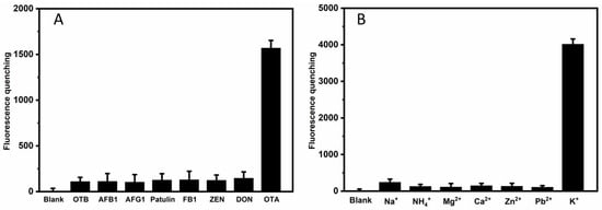 To investigate the selectivity of the sensing method, we compared the fluorescence intensity changes induced by the two sensing systems with potential interfering toxins and ions, respectively. Under optimized conditions, OTB, AFB1, AFG1, FB1, patulin, ZEA, and DON were used as interfering substances for OTA detection. In parallel, NH4+, Na+, Ca2+, Mg2+, Zn2+, and Cd2+ were used as interfering substances for K+ detection. The fluorescence intensity change was detected according to the method described in Section 2.4. All experiments were repeated three times independently.