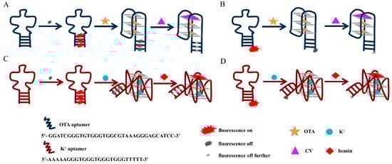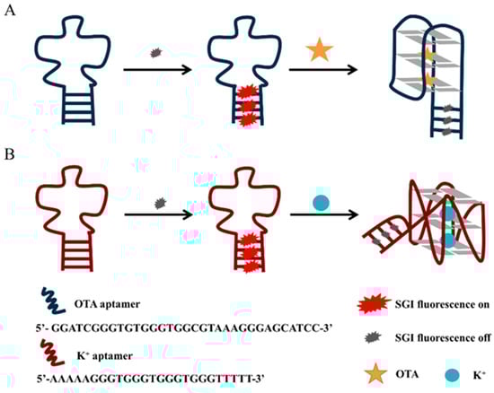 Schematic illustration of fluorescent aptasensors based on G-quadruplex quenching ability (A) for the detection of OTA (B) for the detection of K+.