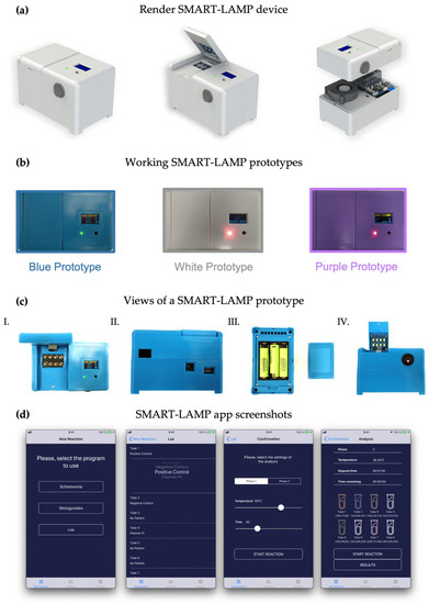 Design and principal features of the SMART-LAMP and SMART-LAMP app: (a) Render of the SMART-LAMP prototype with SolidWorks. From left to right: closed SMART-LAMP; SMART-LAMP with the lid of the incubation module opened; and internal structure of the SMART-LAMP prototype; (b) Top view of the three working SMART-LAMP prototypes used; (c) Different views of the one SMART-LAMP device: I. Top view of the SMART-LAMP device with the incubation module lid opened; II. Posterior view with all ports and device connections exposed, from left to right: fan opening, power supply port and USB port for computer connection; III. Inferior view with the exposed MC73831T and three Li-ion batteries that power the SMART-LAMP device. To the right, the lid used to cover the batteries which is magnetically attached to the device for easy removal and reinstalment; IV. Frontal view of the SMART-LAMP with the lid opened, exposing the overhead with LED used to illuminate samples while RGB measures are taken; (d) SMART-LAMP app screenshots. From left to right: reaction program selection, sample identification, duration and temperature setup through sliding buttons, interface of the SMART-LAMP app while a reaction is being carried out, showing the temperature of the device, the time elapsed and the RGB measurements of each well.