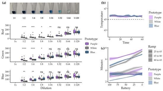 Basic measurements of color readout and temperature profile of the SMART-LAMP devices: (a) Color readout of the SMART-LAMP with MG dilutions in water. In the top picture, 15 μL of MG dilutions in water in 0.2 mL Eppendorf tubes are presented, ranging from a 0.1% w/v dilution (1×) down to 7.81 × 10−4% w/v (1:128), in a 2-fold serial dilution fashion. Boxplots representing RGB values for all eight dilutions are presented (from top to bottom: Red component, Green component and Blue component), measured in triplets in each well of each prototype. ANOVA-test results comparing the three prototypes are presented. (n/s: non-significant, *: p-value ≤ 0.05, **: p-value ≤ 0.01, ***: p-value ≤ 0.001, ****: p-value ≤ 0.0001). (b) Temperature profile for one hour reaction at 65 °C in each prototype. Measured in triplets. (c) Ramping times to achieve reaction temperature (65 °C) from room temperature (25 °C), from reaction temperature to inhibition temperature (80 °C) and from inhibition temperature back to reaction temperature. Measured for different battery percentages. Each measurement was taken in triplicates.