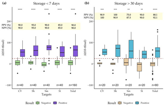 PTC and NTC analyzed with the SMART-LAMP for different dry-LAMP assays and storage times: (a) Differences between values of the R component of RGB 10 min after the start of the reaction and final value at reaction-end for different LAMP assays stored less than 7 days at RT after desiccation; (b) Differences between values of the R component of RGB 10 min after the start of the reaction and final value at reaction-end for different LAMP assays stored over 30 days at RT after desiccation. In yellow boxes, positive predictive values (PPV) and negative predictive values (NPV) of the SMART-LAMP are indicated. Targets: SARS: SARS-CoV-2; Sh: S. haematobium; Sm: S. mansoni; St: Strongyloides spp. Mann-Whitney U test: n/s: non-significant, **: p-value ≤ 0.01, ***: p-value ≤ 0.001, ****: p-value ≤ 0.0001.