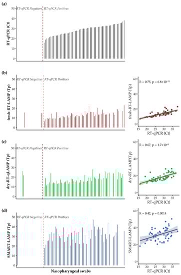 Analysis of RNA samples from patients suspected of having COVID-19. On the left panels, results from the analysis of the 80 samples are shown ordered from low to high RT-qPCR Ct values obtained. On the right panels, correlation plots between Ct and Tp values in RT-qPCR and LAMP assays, respectively, are represented. R and p values obtained by Pearson’s correlation are shown in each graph: (a) RT-qPCR Ct values of the 80 samples analyzed; (b) Fresh-RT-qLAMP Tp values of the 80 analyzed samples and their correlation with RT-qPCR results; (c) Dry-RT-qLAMP Tp values of the 80 analyzed samples and their correlation with RT-qPCR results; (d) SMART-LAMP Tp values of the 80 samples analyzed and their correlation with RT-qPCR results.