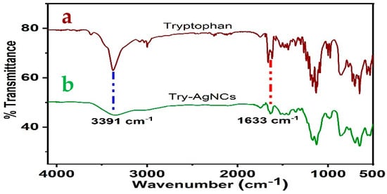 Figure 3 exhibits the infrared spectra of the aqueous solution of tryptophan (a) and the Tryp-AgNCs (b). We can conclude that the distinctive peak of NH2 (3025 cm−1) [51] in the Tryp-AgNCs was wiped out. Further, the significant peak’s display at 3394 cm−1 and 1629 cm−1 related to the indole N–H stretching band and the asymmetric stretching band of carboxylate ion, individually. These distinctive peaks confirm the presence of indole 3-acetic acid [52]. The data prove that the oxidation of tryptophan was established into indole3-acetic acid and effectively binds to the AgNCs.