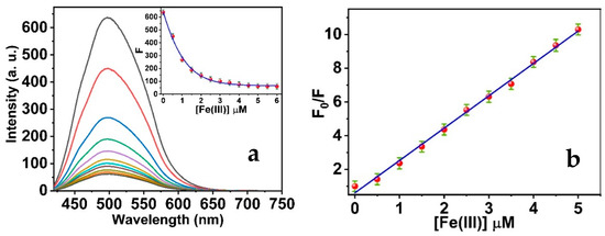 Figure 5. (a) Fluorescence emission of Tryp-AgNCs in the presence of a various concentration of Fe(III) ions from 0.1 to 6 mM; (b) Classical Stern–Volmer plot of fluorescence intensities ratio versus the quencher concentrations.