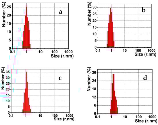 Figure 6. DLS data of Tryp-AgNCs in the presence of (a) 0.05; (b) 1.5; (c) 3.0; and (d) 6.0 μM Fe(III).