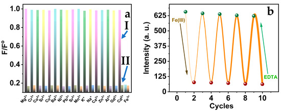 Figure 7. (a) Tryp-AgNCs fluorescence intensities in the presence of (I) each different metal ions and (II) each different metal ions and Fe(III); (b) The recovery effect of EDTA solution on Tryp-AgNCs fluorescence.