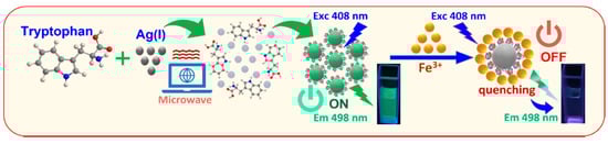 The Tryp-AgNCs were synthesized in the aqueous medium. Typically, the tryptophan amino acid will be applied in this route as stabilizing and reducing agent. A portion of 4 mL of 10 mM Ag(NO3) was mixed with 6 mL of 23.3 mg/mL of tryptophan in water. The prepared mixture was left to stand for three minutes under vigorous stirring, then 0.3 mL 1M NaOH was added to the mixed solution, and the net solution was further stirred for another 3 min. After adjusting the pH to 12.5 using sodium hydroxide solution, the solution was then transferred to a 10 mL microwave sealed tube. After transferring the prepared solution to the microwave tube, the reaction tube was kept in the microwave oven for 20 min (850 W, Anton Paar mono wave 200) with a constant irradiation power. After 20 min, the microwave-assisted Tryp-AgNCs were dialyzed in ultra-pure water for 24 h to remove all of the excess molecules. After dialysis, the Tryp-AgNCs were kept in the dark at 4 °C. The quantum yield of the Tryp-AgNCs was evaluated by using the integrated fluorescence intensities of the nanomaterials and the fluorescein dye that dissolves in ethanol solution as a reference [45].