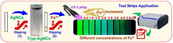 The Tryp-AgNCs, as a new optical sensor, can be applied to a paper test strip method. The Tryp-AgNCs were spread onto a Whatman® cellulose paper strip with a high-quality cotton liner that is modified to provide an α-cellulose content of more than 98%. The sensing nanoclusters were embedded by the tryptophan scaffolds, which can be entrapped in the test strip. The free unbind Tryp-AgNCs were washed out with bi-distilled water. The test strips’ sensitivity toward the Fe(III) ions was investigated by immersing the strips in different Fe(III) concentrations (0 to 4 μM), as shown in Scheme 2. The test strips also display various intense green luminescence after being immersed in Fe(III) solutions based on the concentration of Fe(III) ions, as shown in Scheme 2. Therefore, the designed strips can be utilized to rapidly detect the Fe(III) concentrations.
