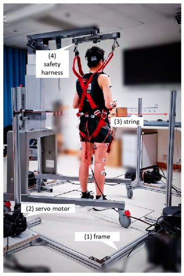 As shown in Figure 1, the waist-pull system for inducing balance perturbations mainly involved: (1) an aluminum alloy frame, (2) four servo motors (130-07725AS4, Wenzhou Guomai Electronics Ltd., Wenzhou, China), (3) four pulling strings, and (4) a safety harness. The four servo motors had a rated output power of 2000 W and a rated torque of 7.7 Nm. One end of the pulling string (1.2 mm-diameter braided polyethylene wire) was wired around a 40 mm-diameter driving wheel connecting to the servo motor, and the other end went through a turn on the frame and was tied to the belt worn by the participant at pelvis level. A commercially available harness system (PG-360, Physio Gait Dynamic Unweighting System, Healthcare International Ltd., Langley, WA, USA) was used to prevent the participant from falling during the experiment.