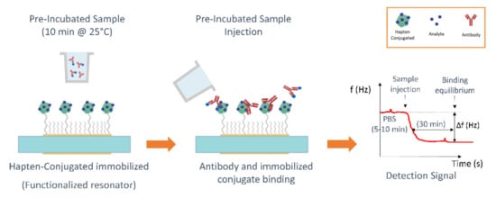 The inhibition assay protocols were based on those previously reported [27,33]. Briefly, in the first step, a mixture of a fixed concentration of the corresponding MAb with standard solutions of the analyte (2.86 × 105 to 2.86 × 10−1 μg/kg) or with the spiked honey samples was preincubated for 10 min at 25 °C. A 20 μL/min continuous flow rate of working buffer (PBS) was pumped through sensors. When a nearly constant baseline was reached (5–10 min), 250 µL of the preincubated mixture were injected over the functionalized immunosensors surface. As the binding between the free antibody and the immobilized conjugate took place, the shifts in f and D were monitored in real time. Binding equilibrium was reached after ~30 min. The regeneration of the reactive surface to break the active antibody-hapten conjugate binding was carried out by pumping 0.1 M HCl for SFZ and 0.1 M NaOH for TBZ at a flow rate of 125 µL/min. All diluted standards were tested at least three times. Injections corresponding to the maximum signal (absence of analyte in the dilution) were run every two standard solution injections for signal normalization and for evaluating the functionalization quality. See in Figure 2 a schematic of the protocol.
