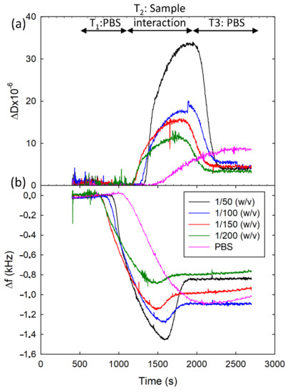 Records of ΔD (a) and Δf (b) acquired to select the honey dilution ratio. Different curves correspond to PBS and different dilution ratios for SFZ analyte with 2 µg/mL concentration for the MAb without loss of generality.