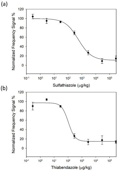 HFF-QCMD array standard calibration curves in honey diluted 1/100 (w/v) in PBS for SFZ (a) and TBZ (b). Each point is the average of eight determinations. Vertical bars represent standard deviations.