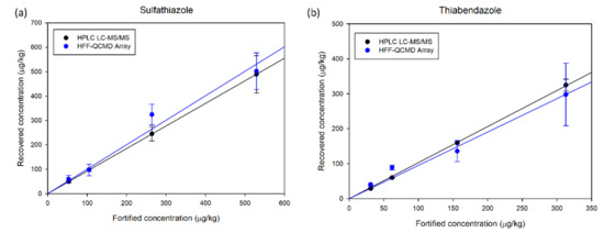 To compare the accuracy of the HFF-QCMD array technique with that of LC-MS/MS, their respective results of recovered concentration when applied to honey samples spiked with the mentioned TBZ and SFZ concentrations were correlated with the fortification levels (Figure 5a,b, respectively). Linear regressions performed provide correlation coefficients above 0.97 for both techniques and analytes. For TBZ, slopes of 0.905 and 1.044 were obtained for HFF-QCMD array and LC-MS/MS, respectively. Regarding SFZ, slopes of 0.973 and 0.924 for HFF-QCMD array and LC-MS/MS were obtained, respectively.
