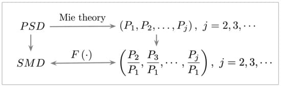 As depicted in Figure 2, according to the Mie theory, we can calculate the intensity () of the scattered light for each channel on the basis of the PSD information and refractive indices. Therefore, the relation between and scattered light intensity () can be established as follows: